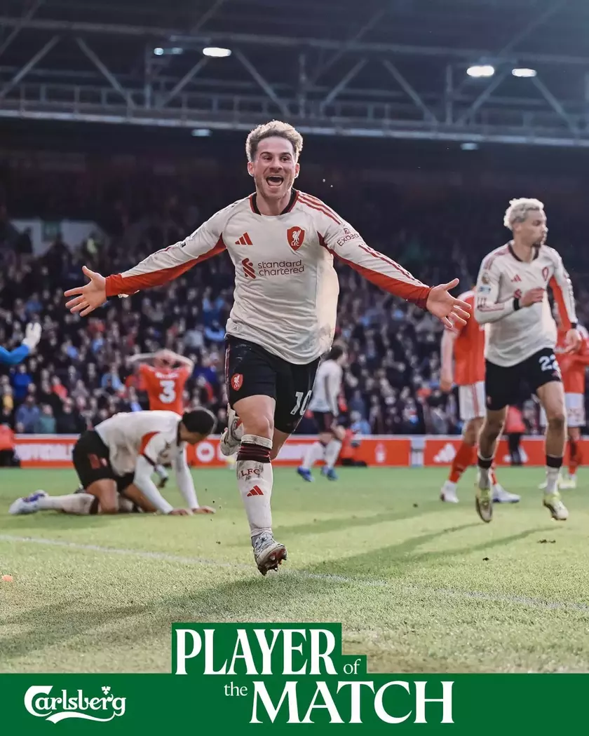 就在人们以为比赛将以平局收场时,奇迹在第90+6分钟上演。利物浦发动最后一次进攻,门前再度形成混战,麦卡利斯特机敏地出现在最危险的位置,一脚补射洞穿森林队球门,这一次VAR确认进球有效!麦卡利斯特在短短4分钟内再度变成英雄,用绝杀进球帮助利物浦带走了宝贵的三分。
