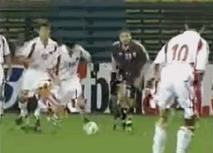 第七轮面对卡塔尔,五里河体育场的球迷齐声高喊,“郝海东,进一个”,在球迷的震天的呐喊声中,郝海东打进了这粒经典的单刀球。