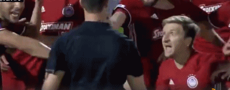 希腊超级联赛第28轮,奥林匹亚科斯本轮比赛不仅丢了冠军还丢了面子,在比赛即将结束的一次进攻中,扳平心切的奥林匹亚科斯抗议对手禁区内有手球嫌疑,团团围住裁判据理力争寸土不让,奥林匹亚科斯球员马林这时候从视频右下角冲了上来,没错,就是那个在切尔西没怎么出场的德国边锋马尔科-马林,只见他贴在裁判身边面红脖子租地跟裁判争辩,但是裁判并未回应,情急之下马林也是突发奇想,居然想出碰瓷主裁判这种套路。裁判只是轻轻伸手推开面前争论的人群,马林却像是被炮弹击中了一样被弹飞倒在地上...