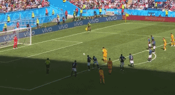 比赛第61分钟,澳大利亚队起高球送入禁区,后点解围的乌姆蒂蒂高高跃起, 并伸出右手干扰了皮球的运行轨迹,裁判果断判罚点球。