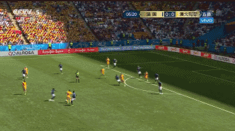 图3:由守转攻阶段利用锋线球员的灵活支点以及传跑,法国队的反击十分迅速,而在将球运作到前场之后,依靠传跑、撕扯上的变化去发挥攻击手的作用。简单的3、4次传递,法国队就在禁区前沿获得了射门的机会,但是,也能看出澳大利亚队回防能力上的出色。