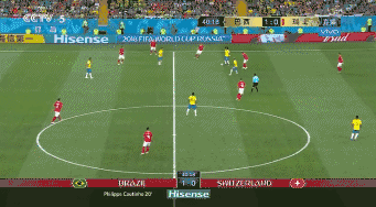 图2:巴西队左侧强攻进行的十分坚决,内马尔、库蒂尼奥、马塞洛的左侧强攻并未完全被瑞士队的团队防守所限制。而且,巴西队的左侧强攻带来的压迫,让瑞士队完全没有能力增加外外围的保护,让善于远射的库蒂尼奥在自己擅长的区域打出穿云箭。