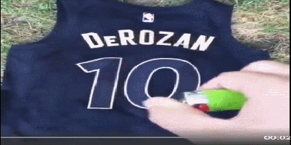 有一位球迷晒出一段视频,球迷一开始假装欲烧德罗赞的球衣却随即反转并配上了4组字:猛龙真是愚蠢、交易当家球星、炒掉最佳教练、多伦多爱你德罗赞!