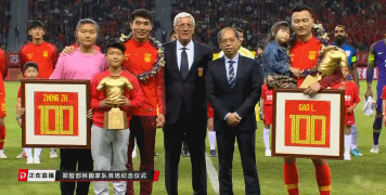 随后郑智和郜林先后获得印有“100”字样的纪念球衣和金灿灿的奖杯,中国足协常务副主席张剑和国足主帅里皮为他们颁奖,并且进行合影。
