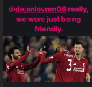 萨拉赫本场比赛打进一个点球,赛后他在INS Story上传了和法比尼奥的庆祝照,并放大了一旁洛夫伦的表情。