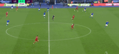 第74分钟,菲尔米诺前场右路得球转身传球,米尔纳得球分边,亚历山大-阿诺德前场右路右脚低平球传中,菲尔米诺后点得球右脚推射梅开二度,莱斯特城0-3利物浦。