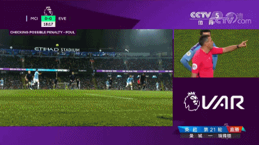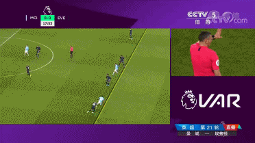 比赛第18分钟,费尔南迪尼奥后场长传球,马赫雷斯拿球后突入禁区,在和埃弗顿后卫迪涅身体接触后倒地,但边裁此时已经举旗示意马赫雷斯越位。曼城球员们对这次判罚并没有太大争议,但VAR却突然介入,要求重看视频慢镜头回放。随后VAR显示,马赫雷斯并未越位,边裁举旗判罚错误。