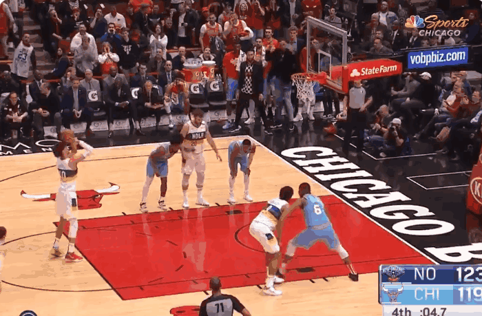 比赛最后时刻出现了有趣一幕,鹈鹕领先4分,新秀中锋海耶斯被送上罚球线,并且两罚不中。令人哭笑不得的是,公牛中锋费利西奥随即用一个扎实的补篮动作将球放回了篮圈,鹈鹕领先到6分,这个乌龙球的两分记在了奥卡福的头上。