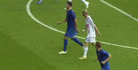 在2006年的世界杯,意大利与法国杀入了最后的决赛,两队一度踢成1-1平局。法国队场面占据优势,但是齐达内在法国占优的情况下头撞马特拉齐,最终被红牌罚下。法国队顿时没有了优势,最终在点球大战输给了意大利无缘冠军。