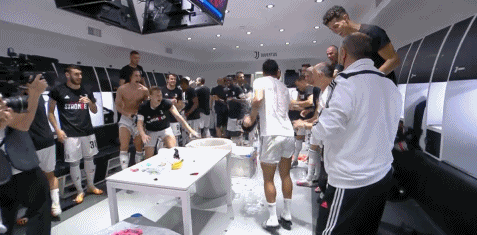 今日凌晨,尤文主场2-0战胜桑普多利亚,提前2轮完成意甲9连冠。赛后尤文全队在更衣室内开香槟庆祝,面对镜头C罗露出开心的笑容。首次获得意甲冠军的老帅萨里,成为了队员们的“集火目标”,被浇上了满头白色泡沫。