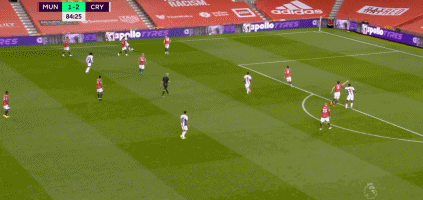 第34分钟,拉什福德拿球晃了半天后18码处强行射门被挡出。第37分钟,门萨禁区右肋回传,詹姆斯12码处射门被挡出。第39分钟,B-费尔南德斯禁区前沿挑传,博格巴和米切尔在禁区内身体接触后摔倒,博格巴右脚的鞋都被踩掉。VAR介入后认为没点球但给了曼联罚球弧顶的任意球,B-费尔南德斯主罚射门被人墙挡出。补时第1分钟,扎哈传球,阿尤禁区内晃出空档后8码处射门,德赫亚奋力扑出。上半场结束,曼联0-1水晶宫。