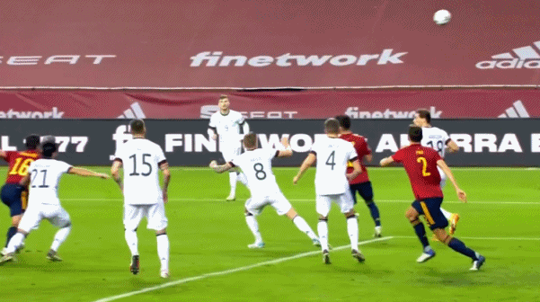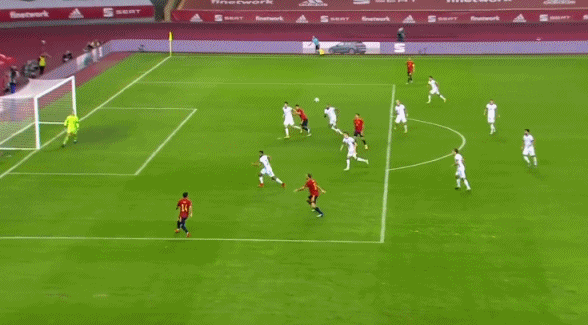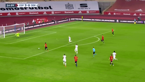 第54分钟,法比安-鲁伊斯挑传,加亚突破到禁区左侧后横传,费兰-托雷斯调整后铲射得分,西班牙4-0德国!