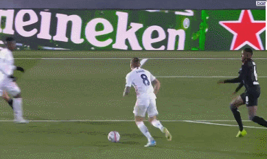 第54分钟,莫德里奇右路横传,克罗斯外围一脚兜射,皮球高出横梁。