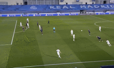 第43分钟,皇马获得前场定位球机会,克罗斯左侧任意球传中,本泽马禁区内头球击中防守球员稍稍偏出球门。