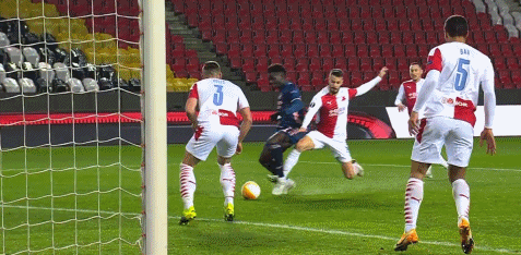 欧联1/4决赛次回合,阿森纳客场迎战布拉格斯拉维亚,首回合双方战成1-1。阿森纳开场攻势如潮,第14分钟,萨卡内切弧线球射门中柱,史密斯-罗补射破门,但因越位在先被判无效。