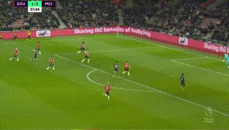 比赛的第38分钟,曼城拿到绝佳的扳平机会。福登在左路送出漂亮的传中,后点的斯特林门前无人防守,他的位置靠近右门柱,而南安普敦门将福斯特则靠近左门柱。面对如此良机,斯特林有点犹豫,射门太正了,不偏不倚射在了福斯特身上,他想补射,但福斯特用脚将球踢走。