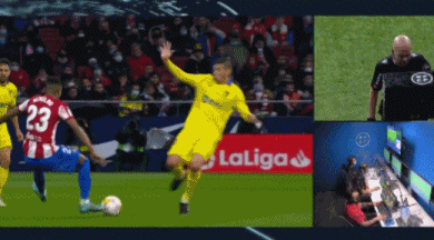 第39分钟,雷尼尔多拼抢时铲倒鲁文-阿尔卡拉斯,主裁判直接出示红牌,随后主裁判又到场边亲自确认VAR,取消了红牌判罚,改用黄牌警告了雷尼尔多。