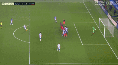 伤停补时第2分钟,贾努扎伊主罚弧顶任意球直接攻门被奥布拉克扑出,古里迪门前头球补射破门,为皇家社会扳回一球,1-2。