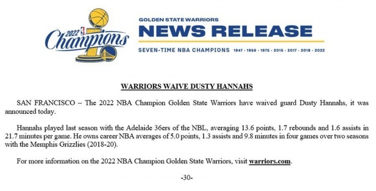 nba直播讯 勇士队官方公告:球队已经裁掉了后卫达斯蒂-汉纳斯,他将会与圣克鲁兹勇士签约。