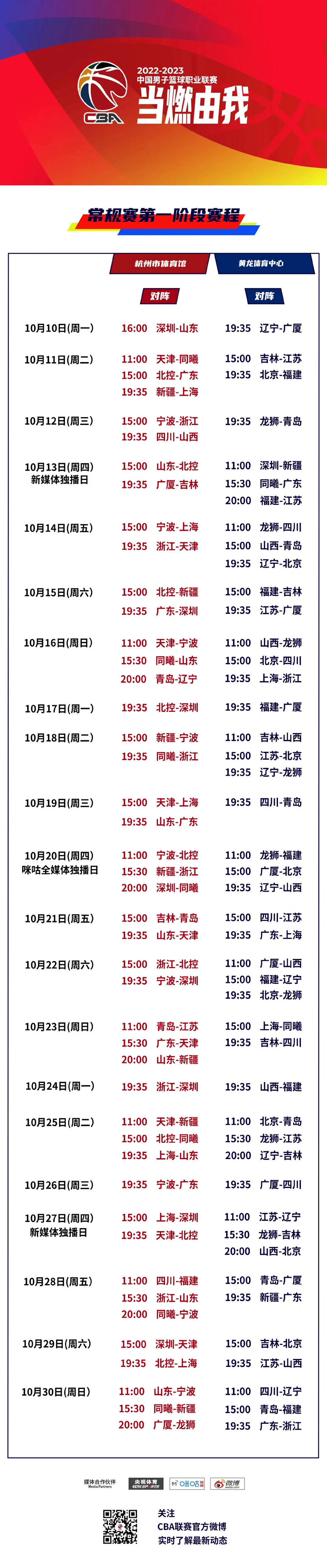 nba直播讯 CBA官方发布公告:CBA新赛季第一阶段赛程,10月10号开打,揭幕战为深圳vs山东、辽宁对阵广厦。