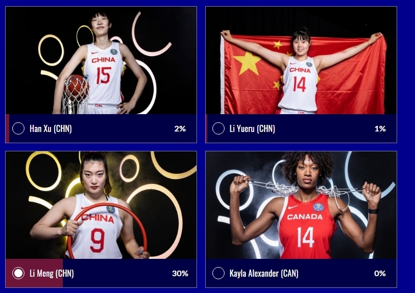 目前李梦得票率高达30%暂时遥遥领先,得票率第二的为美国球员托马斯(20%),第三为澳大利亚球员塔尔伯特(10%)。