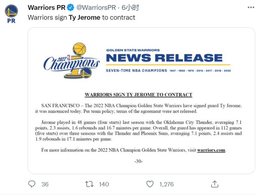 上周,他被雷霆队交易到火箭队,之后被火箭队裁掉。勇士官宣中表示,由于球队政策原因,未透露杰罗姆合同的具体情况。