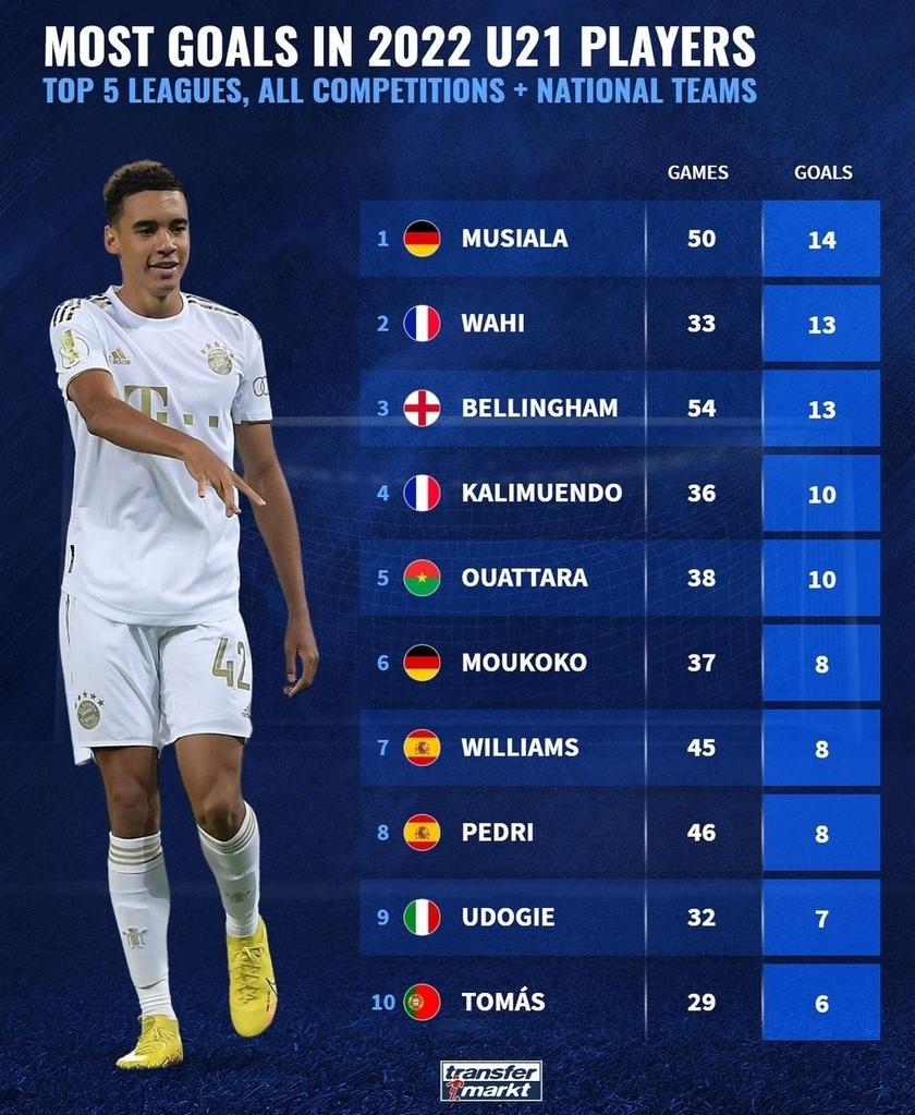 nba直播讯 德转盘点了2022年五大联赛U21球员在俱乐部以及国家队各项赛事中进球榜,其中穆西亚拉居首,贝林厄姆、穆科科等球员在列。以下为具体榜单: