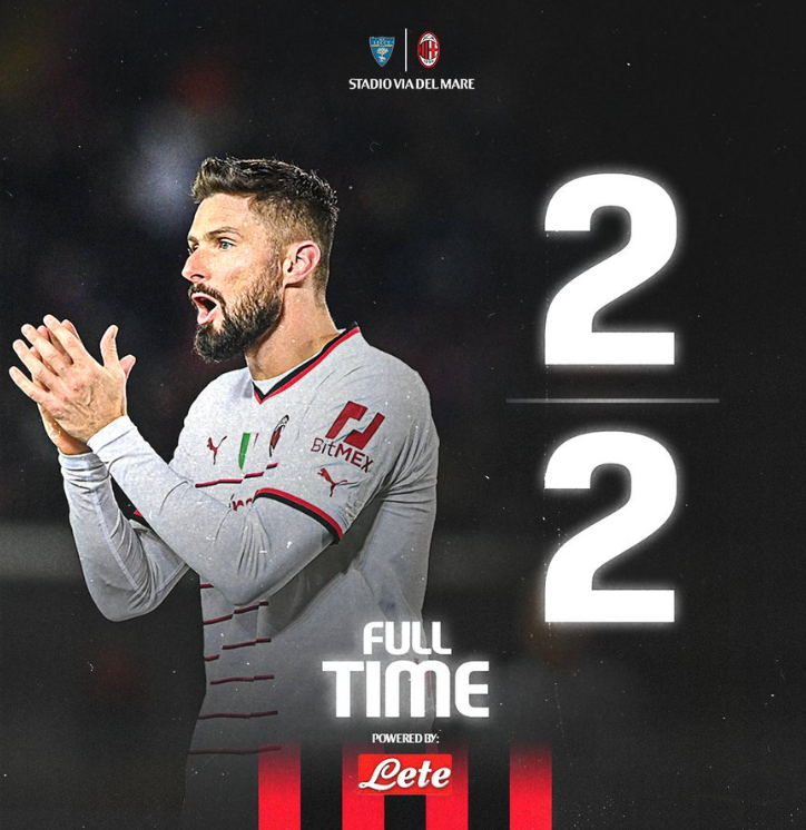 最终,AC米兰2-2战平莱切,与榜首那不勒斯的差距拉大到9分。