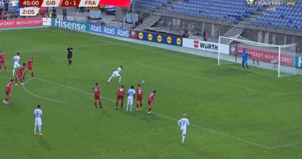 第2分钟,科曼右路摆脱后传中,吉鲁头球攻门得手!法国1-0!