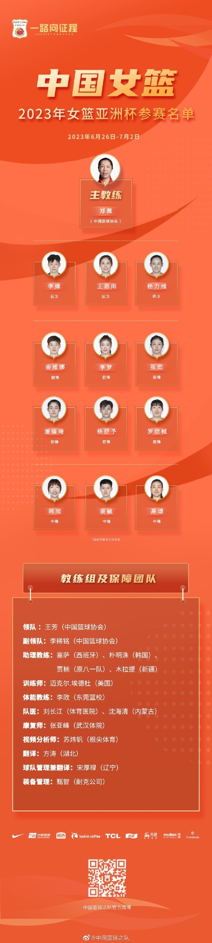 nba直播讯 今日,中国篮球之队公布了2023年女篮亚洲杯中国女篮参赛大名单。具体如下: