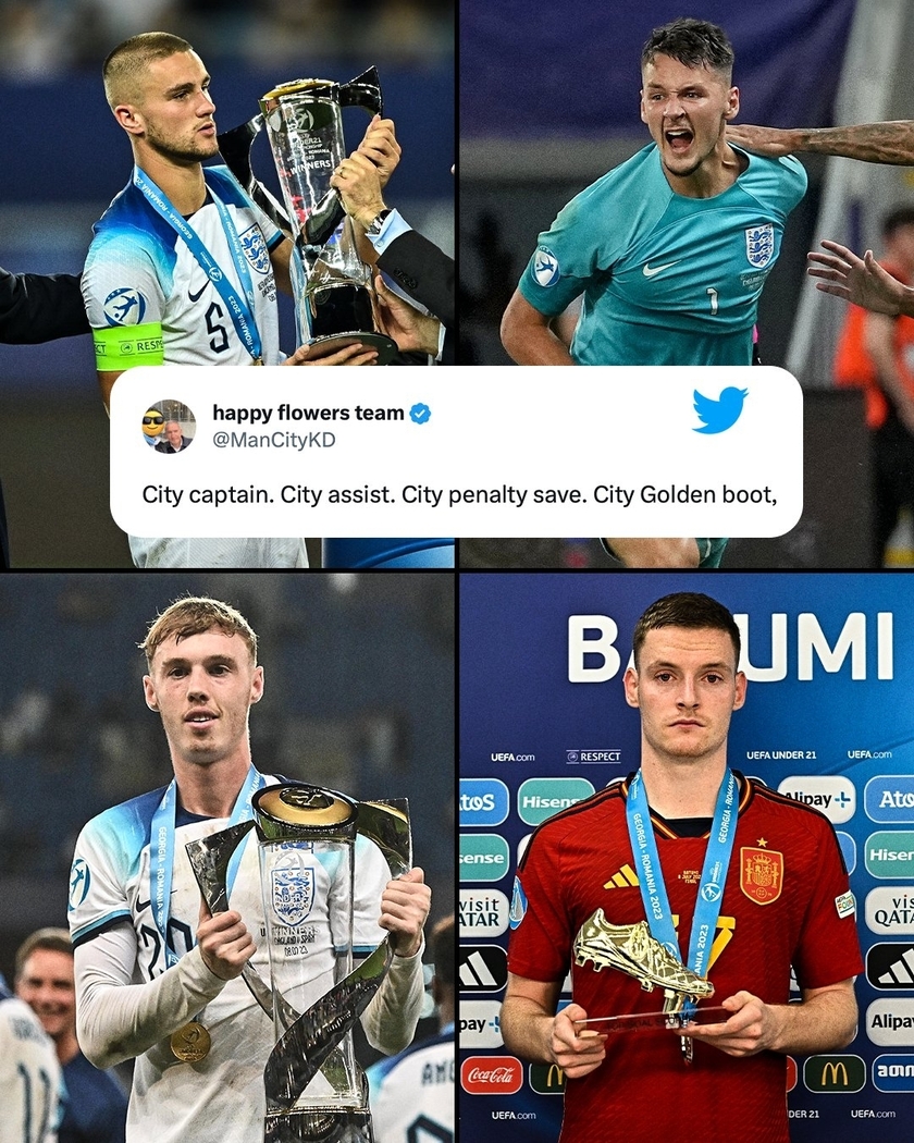 ESPN晒出一张图:英格兰队长贝里斯、补时扑点的门将特拉福德、金靴得主塞尔吉奥-戈麦斯、决赛为制胜球送出助攻的帕尔默全部来自曼城。