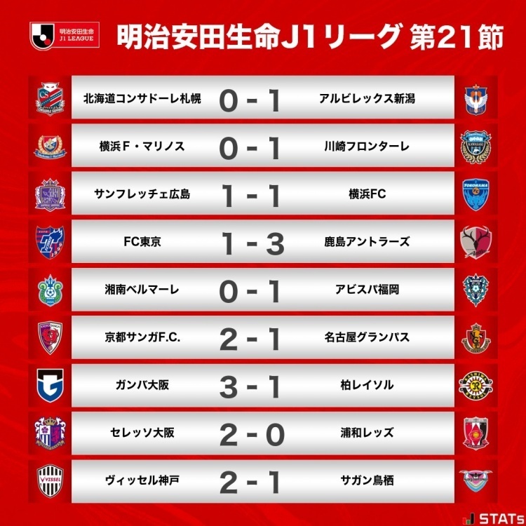 J1联赛第21轮赛果👇