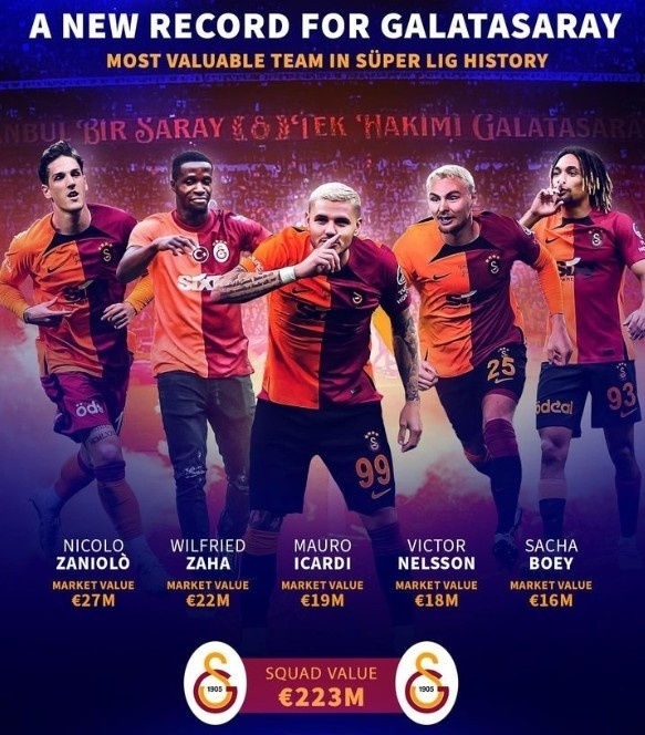 而加拉塔萨雷当前总身价已经达到2.23亿欧元,这也打破了土超俱乐部的总身价最高纪录。