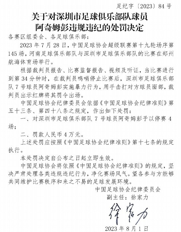 足协官方:阿奇姆彭停赛4场罚款4万!顾操停赛2场罚款2万