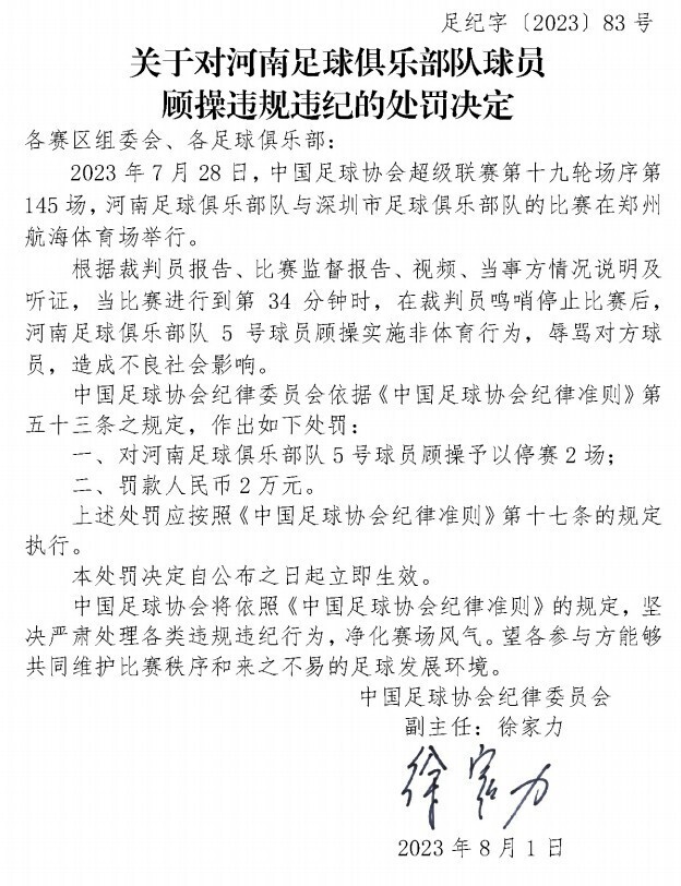 足协官方公告:深圳队球员阿奇姆彭击打顾操面部,停赛4场,罚款4万。顾操辱骂阿奇姆彭,停赛2场罚款2万。