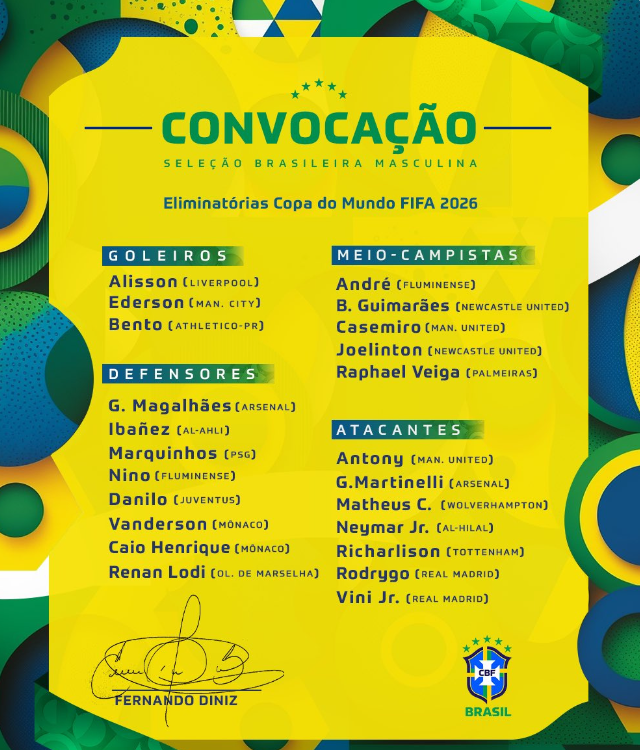 前锋:安东尼(曼联)、马丁内利(阿森纳)、库尼亚(狼队)、内马尔(利雅得新月)、理查利森(热刺)、罗德里戈(皇马)、维尼修斯(皇马)