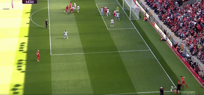 第54分钟,利物浦开出角球,努涅斯在禁区头球摆渡,萨拉赫后点包抄破门得分,利物浦3-0!