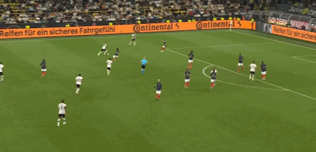 第87分钟,哈弗茨前场直塞球给到萨内右路突破到禁区小角度打门球进,德国2-0!