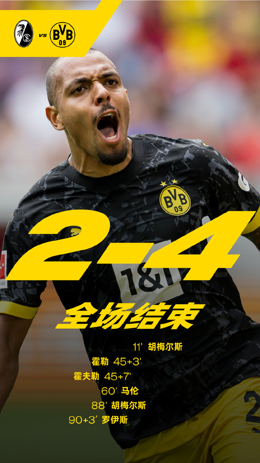 nba直播讯 北京时间9月16日晚上21:30,德甲第4轮,多特客场对阵弗赖堡。上半场,胡梅尔斯头槌破门,格雷戈里奇伤退,霍勒扳平,霍夫勒反超!下半场,马伦单刀扳平,霍夫勒染红,胡梅尔斯双响,罗伊斯锁定胜局。全场结束,多特4-2弗赖堡。