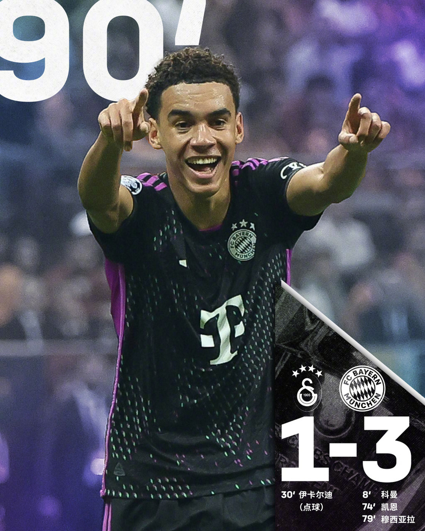 第80分钟,哈里-凯恩投桃报李助攻穆西亚拉破门扩大比分,拜仁3-1!