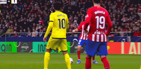 第20分钟,瑟洛特劲射被扑,莫雷诺补射打入死角!马竞0-1比利亚雷亚尔