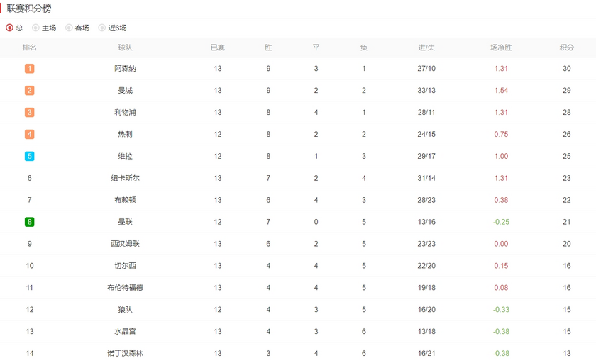 完整积分榜,阿森纳30分第一,曼城29第二,利物浦28第三。