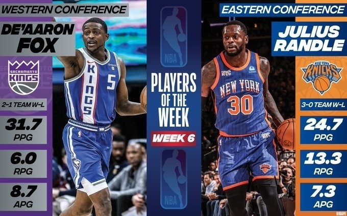 nba直播讯 NBA官方今日公布了上周东西部周最佳球员得主,兰德尔和福克斯分别当选。
