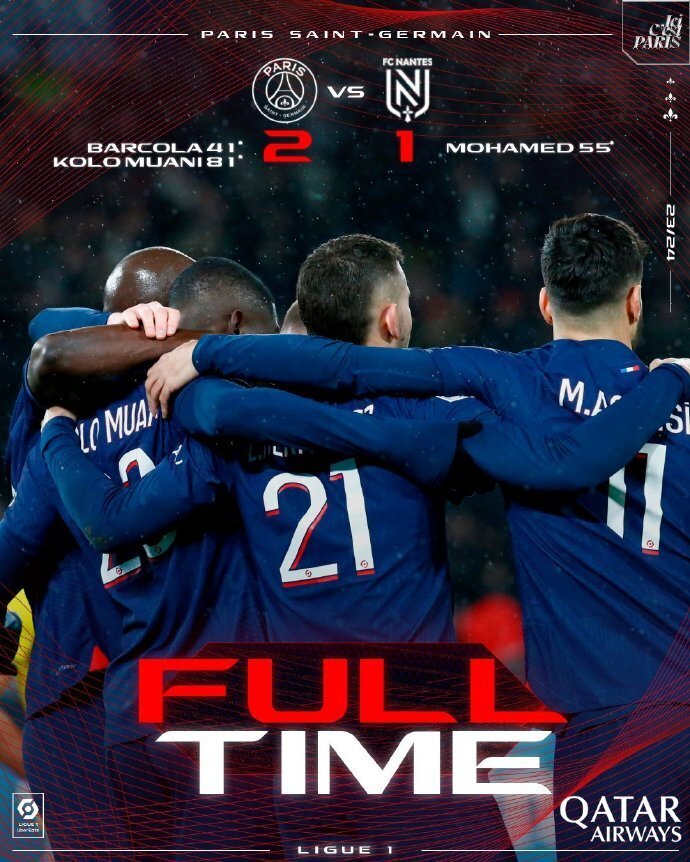 nba直播讯 北京时间12月10日凌晨4时,法甲第15轮,巴黎主场2-1绝杀南特。上半场,巴尔科拉首开纪录;下半场,莫斯塔法-穆罕默德扳平,穆阿尼替补绝杀。最终巴黎取得联赛8连胜,以6分优势继续领跑法甲。
