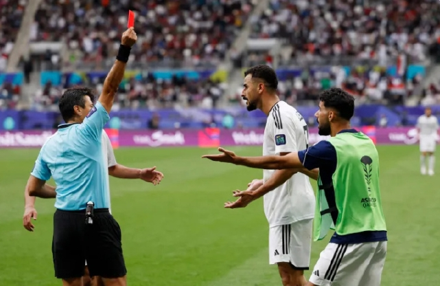 争议判罚!埃曼-侯赛因进球后模仿约旦队庆祝吃到第二张黄牌被罚下!