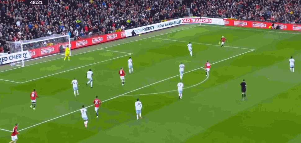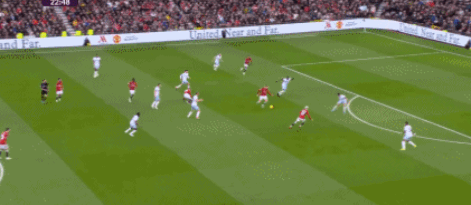 第24分钟卡塞米罗拦截成功并送出妙传,霍伊伦得球扣过一名防守球员后在弧顶附近低射得手帮助曼联取得领先。