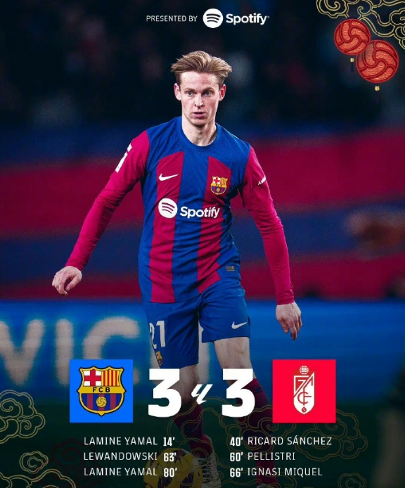 nba直播讯 北京时间2月12日,西甲联赛第24轮,巴塞罗那主场对阵格拉纳达。上半场,坎塞洛助攻亚马尔推射破门,里卡德-桑切斯扳平比分;下半场,佩利斯特里推射破门,莱万低射建功,米克尔头槌,亚马尔远射扳平,最终巴萨3-3格拉纳达。