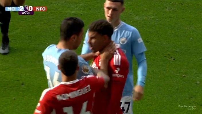 此前曼城对阵水晶宫的比赛中,曼城中场罗德里也曾因锁喉动作染红!