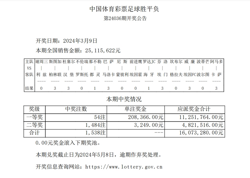 3月9日,胜负彩第24036期比赛全部结束,开奖结果揭晓,彩果方面,意甲赛程,那不勒斯1-1战平都灵爆出3.30倍冷平,另外尼斯主场1-2爆冷不敌蒙彼利埃,而其他五大联赛方面,巴萨主场1-0小胜马洛卡,斯图加特主场2-0完胜柏林联合,还有就是荷乙,基本上全正路,最后德乙和葡超的赛事也没有重大的爆冷出现。