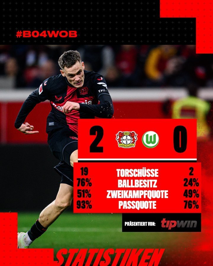 德甲联赛第25轮勒沃库森迎战沃尔夫斯堡的比赛,上半场维尔茨中柱,延茨被罚下,格里马尔多助攻内森泰拉破门,下半场帕拉西奥斯助攻维尔茨抽射破门,最终勒沃库森2-0十人沃尔夫斯堡10分领跑,药厂各赛事36场不败。